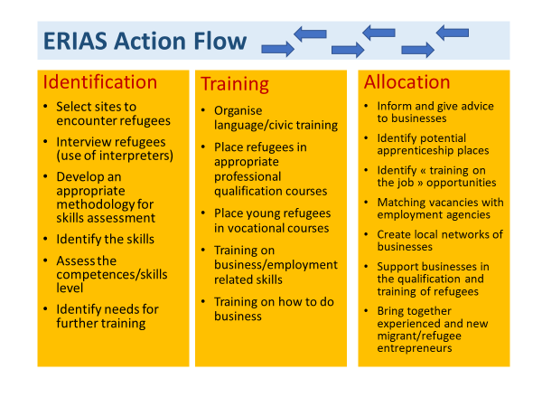 ERIAS local partnerships are to develop a regional action plan that will be implemented together with the relevant local players. Each partner agrees, in this context, to make a specific contribution in delivering the activities that are needed for a successful labour market integration and are described in the following action flow.